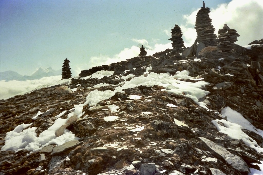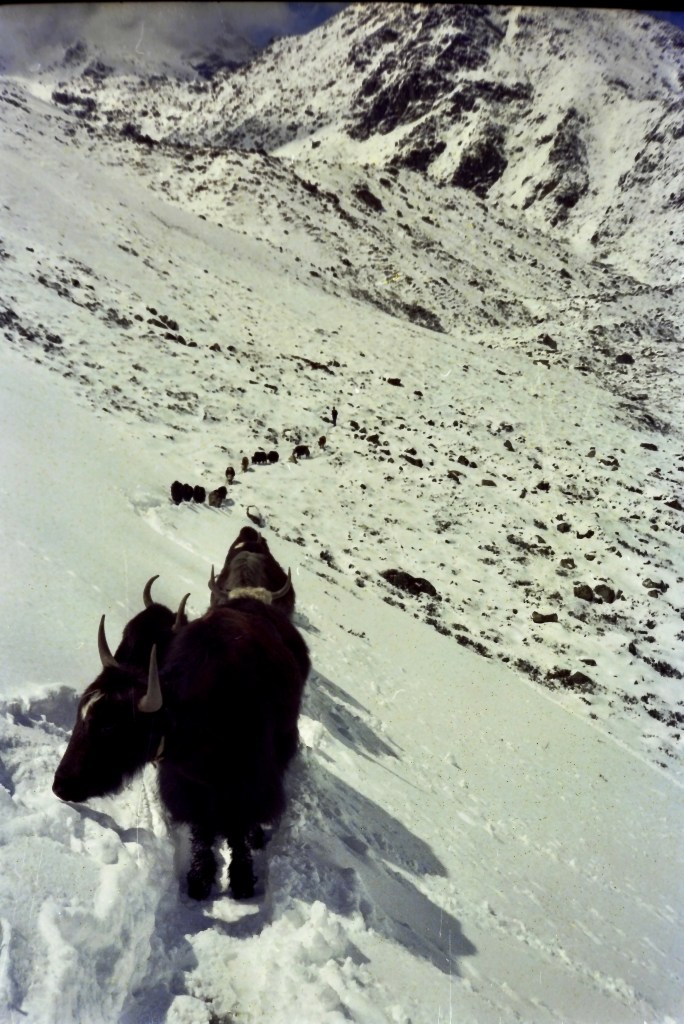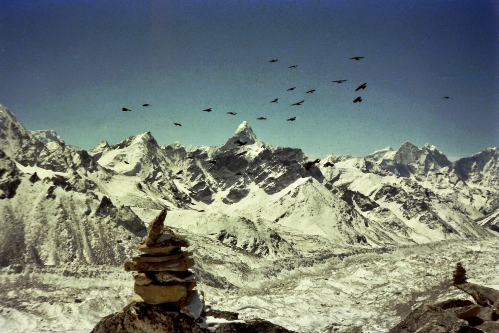 Ama Dablam https://en.wikipedia.org/wiki/Ama_Dablam“As with all the trails winding their way through the Solu foothills and into the Khumbu region, there were piles of cairn stones guiding the way. Wandering along, very alone, on these Himalayan trails, these heaped up stones are a solo trekker’s best friend.” Chapter 3Gokyo Ri “Knowing this might be a once in a lifetime experience, I made side excursions to Gokyo Ri and Chukhung Ri.”Chapter 2Chukhung Ri https://en.wikipedia.org/wiki/ChukhungGlacial moraine from Chukhung Rihttps://en.wikipedia.org/wiki/MoraineMaking friends fast while snowed in for several days at Gokyo.“Often, upon gaining a hard mountain pass, with only the sound of prayer flags fluttering in the wind, I’d stoop down and add another stone atop their jagged crown.” Chapter 3“After a few days’ rest, I took off into the huge ice bowls within the high Khumbu Himalaya.” Chapter 2Yak train on the trailhttps://en.wikipedia.org/wiki/Yak“The day had begun with a clear blue sky but like most spring afternoons in the Nepali Himalaya, the cotton ball clouds had wafted up over the carved mountain passes and then down into the valleys, draping the landscape in their velvety alabaster robes.” Chapter 3“The hoary sky had descended upon the massive boulders and shattered piles of rubble which were strewn across the rocky plateau all around.” Chapter 3“Looking behind me, the clouds had deepened into a sinister darkness, as if a smokestack from a coal plant had tipped over. Turning my attention to the path in front, the fog had obscured all visibility beyond fifty feet.” Chapter 3