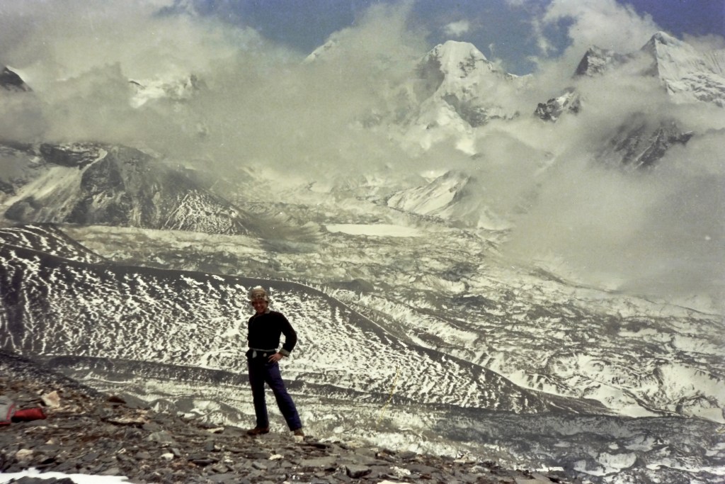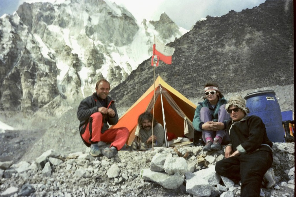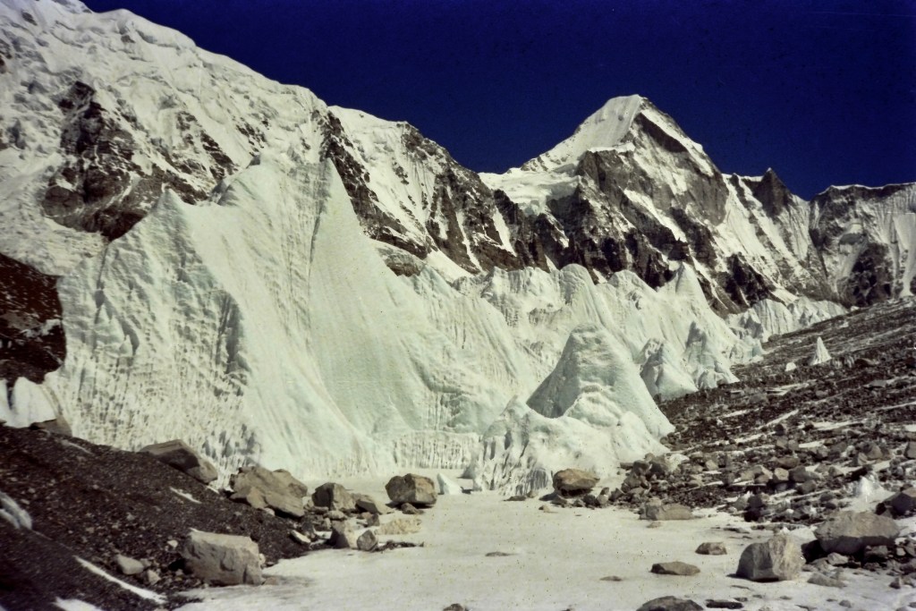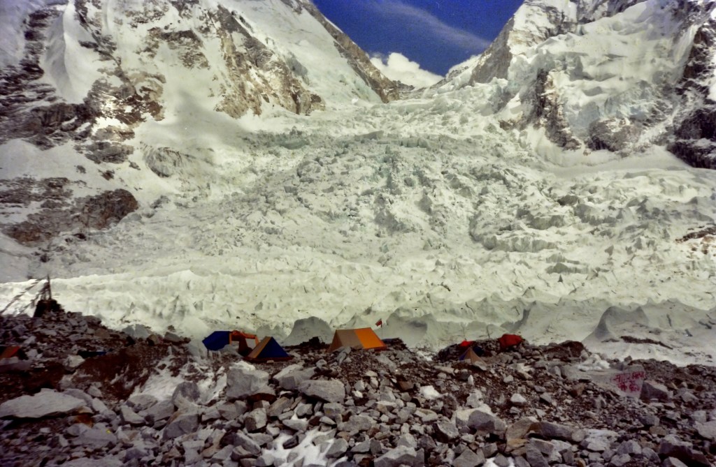 On the moraine toward Basecamp. “Glancing around, I saw I was amid a forest of ice stalagmites randomly poking up from the ground. The oppressive weight of the surface rocks upon the glacier beneath cause this unusual occurrence. The seracs were anywhere from a couple of feet tall to gigantic blocks which towered over my head.” Chapter 4 https://en.wikipedia.org/wiki/Khumbu_Glacierhttps://en.wikipedia.org/wiki/SeracMt. Everest Basecamp #1 at the foot of the Khumbu Glacier https://en.wikipedia.org/wiki/Khumbu_GlacierPolish Mt. Everest expedition 1986