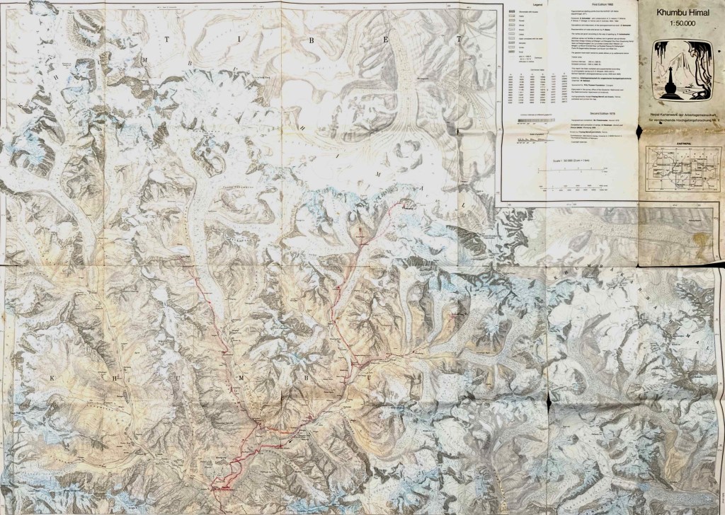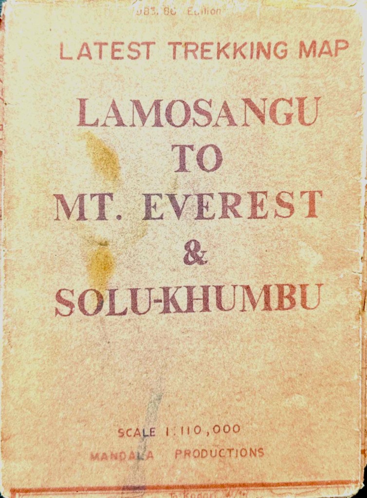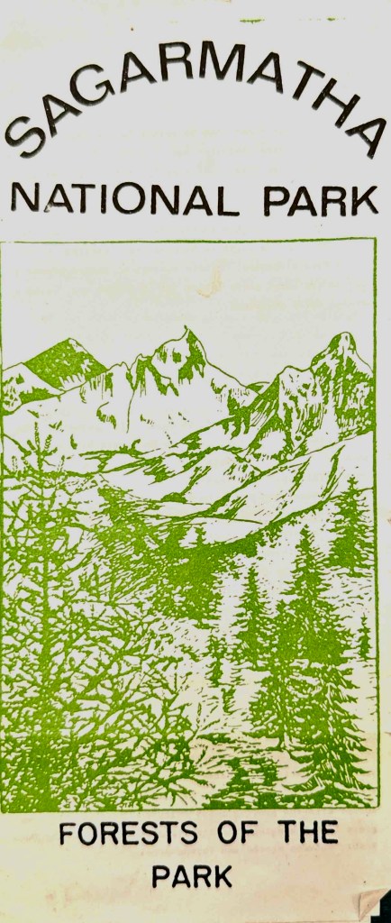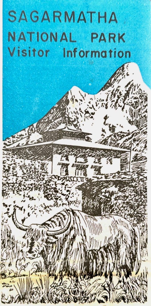 Trekking map of the Khumbu Himalaya region of NepalDetail of the segment depicted in Sky Glow. Red lines penciled in by myself. ” … with quivering hands pulled out my German, 2nd edition Geo-Buch, Khumbu Himal, detailed trekking map. Again, I followed the dotted lines across the page to Loboche. Inspecting the route toward Gorek Shep, I was dumbfounded to see that there weren’t any dots to delineate the way either.” Chapter 3“Stooping down out of the turbulence in the refuge of the boulder, I lit up a bedis and unfolded my Nepali edition Mandala Trekking Map.” Chapter 3Brochures from the ranger station at the checkpoint upon entering Sagarmatha (Everest) National Park